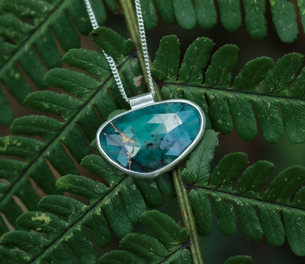 This beautiful stone cracked while I was setting it but it felt too special to discard. Inspired by the Japanese art of kintsugi, I filled the fracture with gold leaf, celebrating its story rather than hiding it. The pendant is simply set with a delicate real leaf imprint on the back, a quiet reminder of the beauty found in nature’s smallest details.