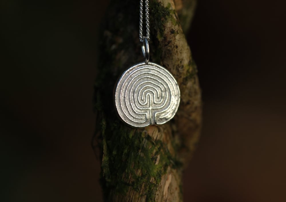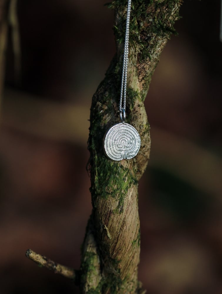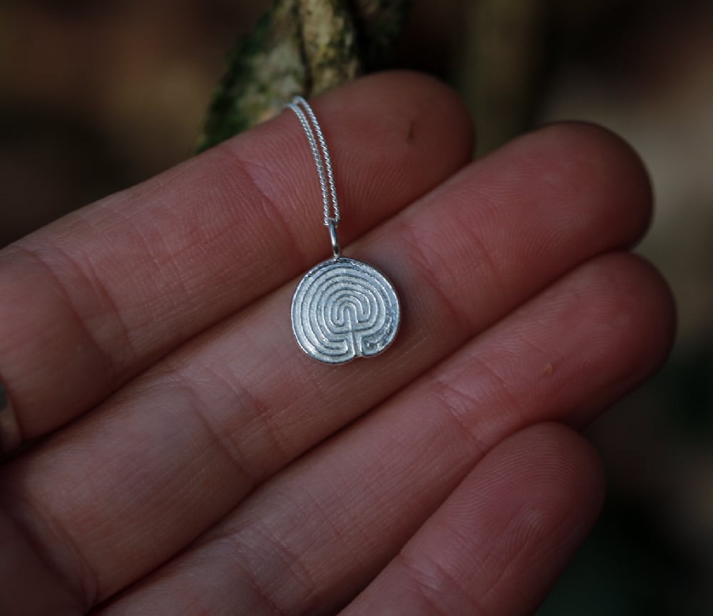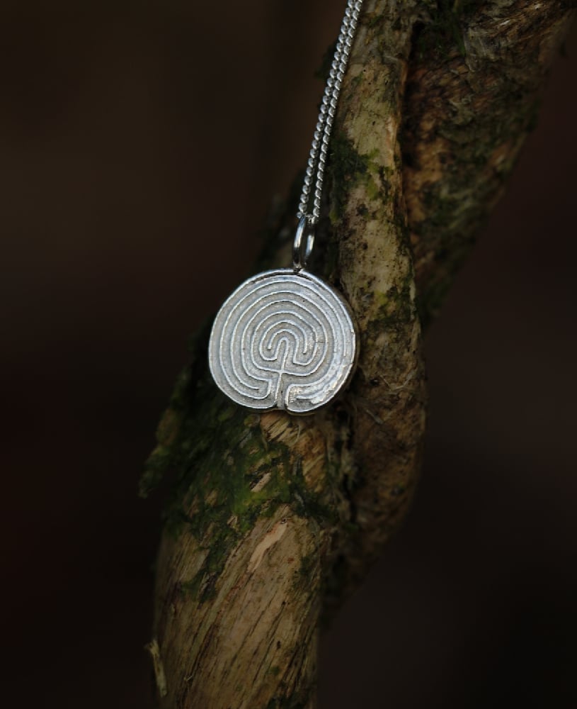 A beautiful tiny silver labyrinth necklace, inspired by the ancient rock carvings at Rocky Valley in Cornwall.
