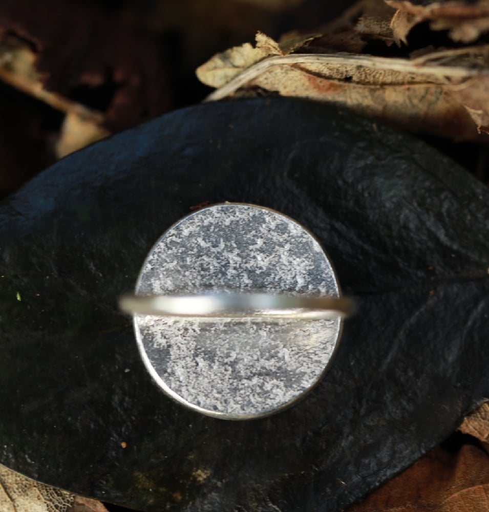 Its night sky magic makes this stone truly special. I’ve set the flat stone simply and echoed its natural textures on the reverse. It rests on a slim band with a subtle, organic texture.