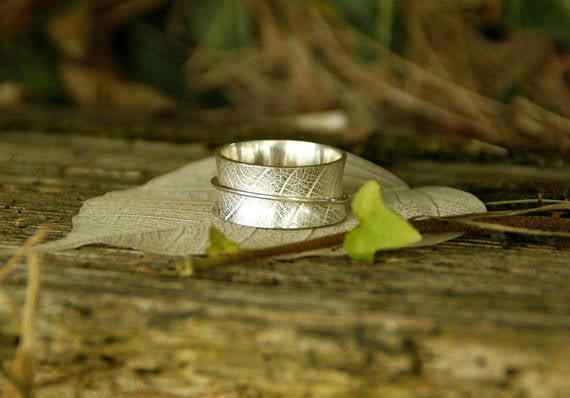 This is a beautiful everyday wear sterling silver ring, featuring a single spinning band. The spinner floats over a leaf embossed 8mm fluted band.