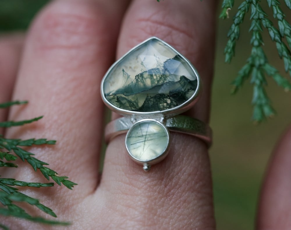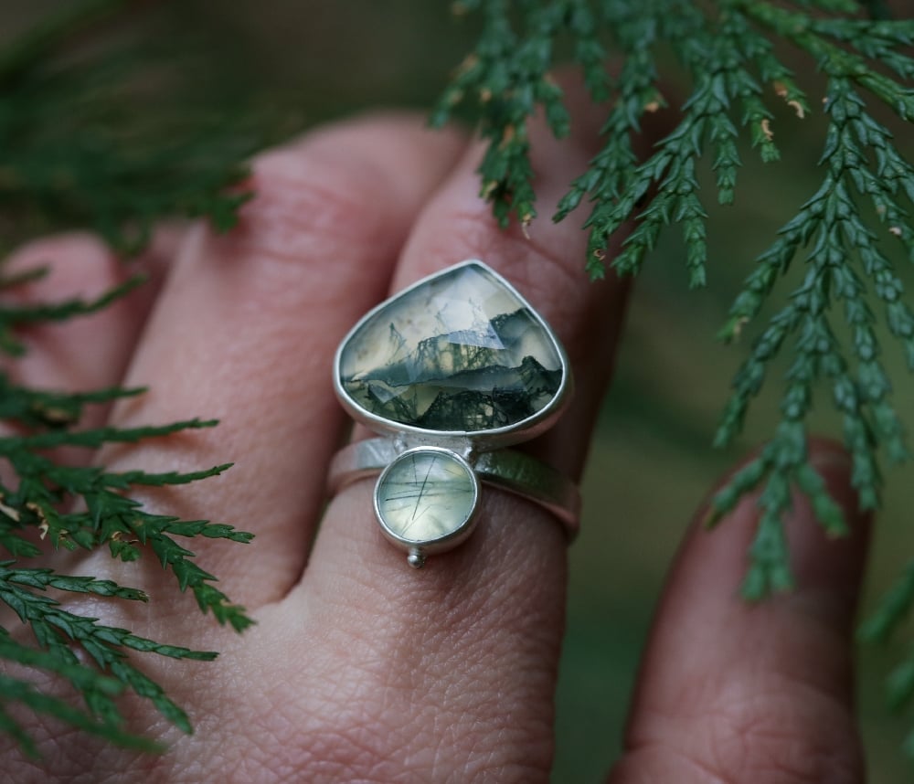 A really striking double stone ring featuring a rosecut pear shaped moss agate with deep, natural moss like inclusions. A gentle reminder to pause and notice the small details in nature. Below sits a smooth, softly rounded green prehnite. Both stones are simply set on a slim, leaf imprinted band adorned with delicate silver dew droplets.