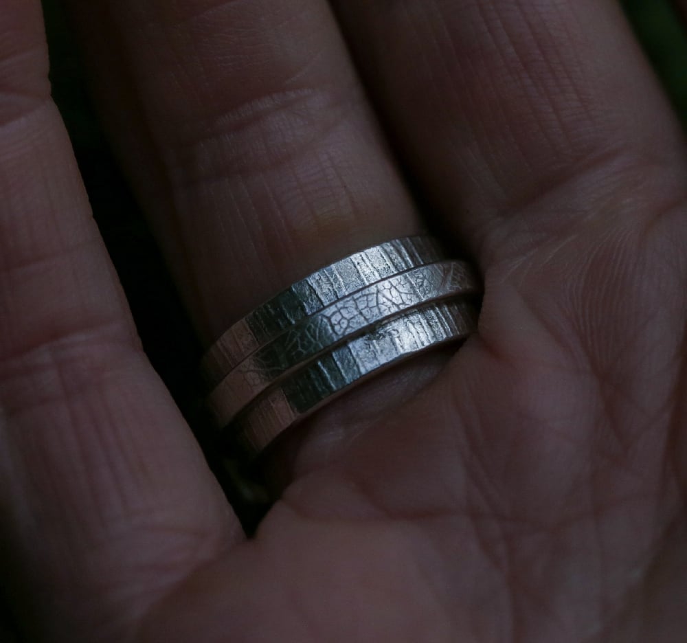 The sterling silver band is imprinted with a subtle bark like texture, finished with a central strip patterned from a real leaf, bringing the essence of the woodland to your fingertips.