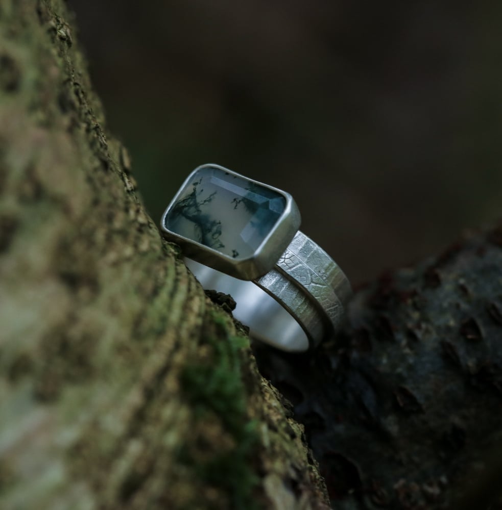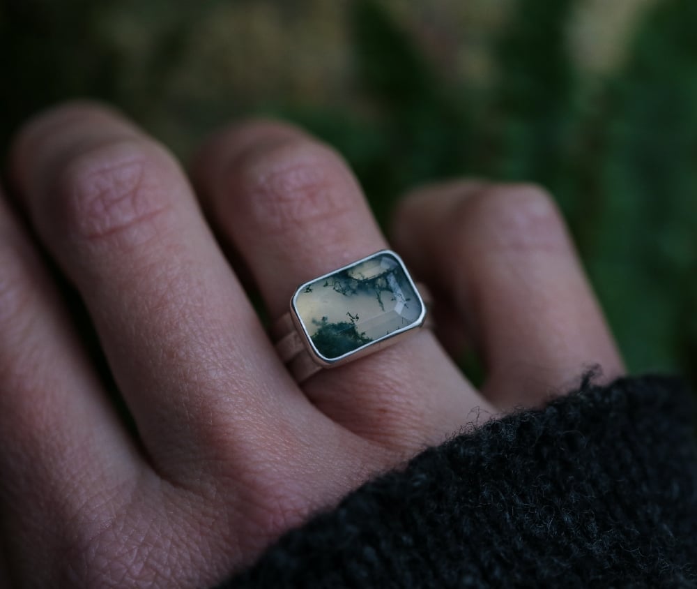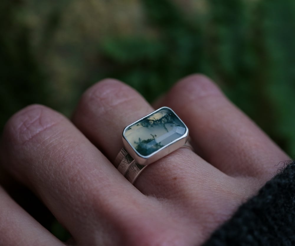 I adore this ring. It features a beautifully cut moss agate, filled with rich darker moss like inclusions, a little reminder to pause and notice the small details in nature.