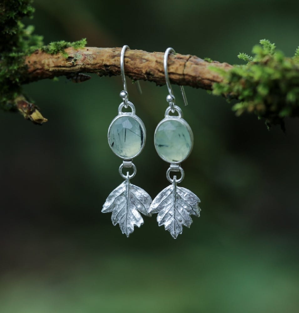 Small cast silver hawthorn leaves hang softly beneath glowing rosecut green prehnite, each stone holding its own unique darker inclusions. A delicate leaf print rests behind the stones on the backplate, adding a quiet layer of hidden beauty. Hawthorn, long associated with protection, renewal and the welcoming of new beginnings, brings a gentle sense of guarding and heart-opening energy to these earrings.
