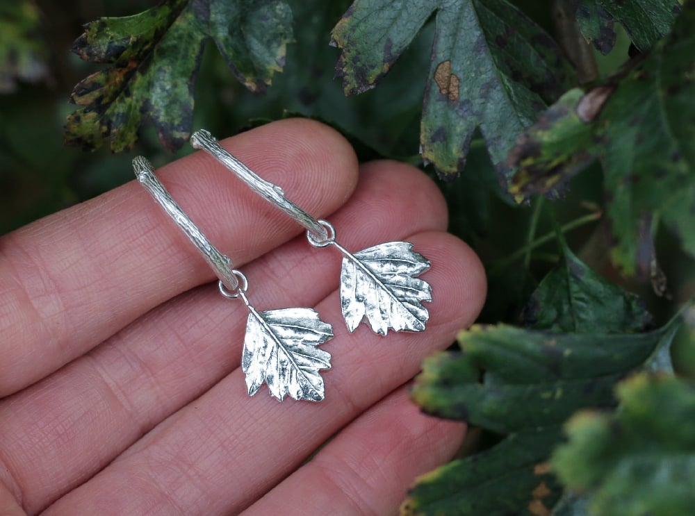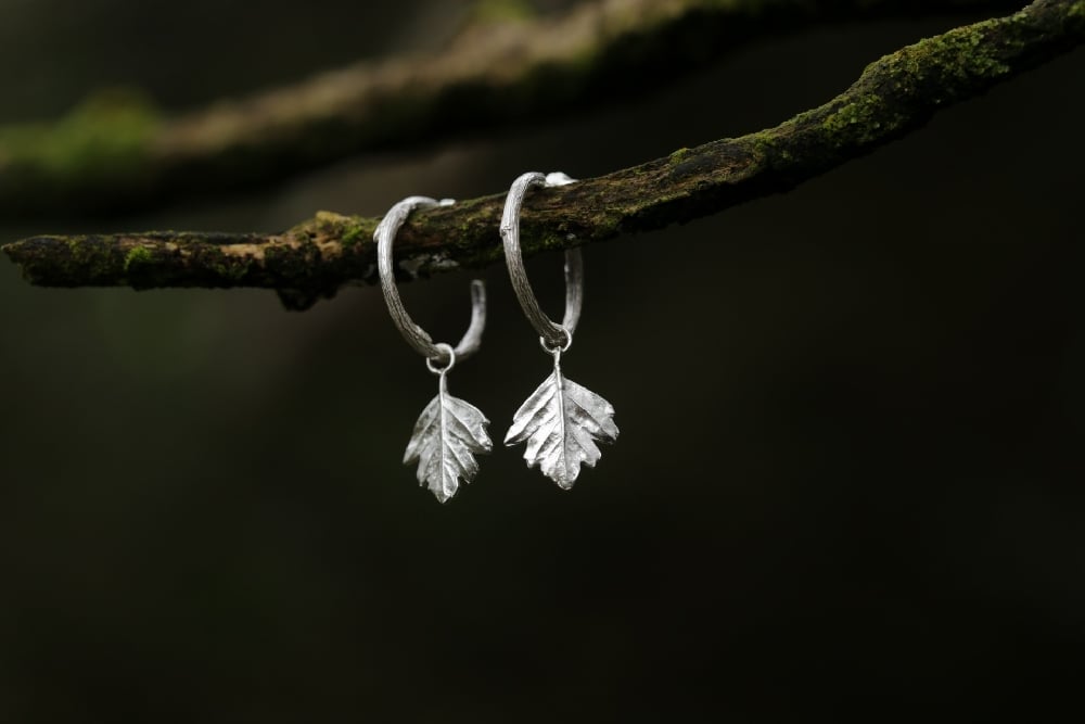 Silver hawthorn leaves hang freely from handcrafted twig hoops, both cast from real twigs and foliage foraged from my garden. Hawthorn carries a deep sense of magic, long believed to be a tree of protection and enchantment. It’s said to guard the heart, invite courage and connect us to the unseen making these earrings feel like tiny talismans of wild folklore and quiet woodland wonder.